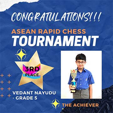 Congratulations to Vedant Nayudu from Grade 5! Competing with 38 students in Singapore, he has won the 3rd place in the ASEAN Rapid Chess Tournament, "under 10" group category! The tournament was held on 26 December 2021, organized by ASEAN Chess Academy and in co-operation with the Singapore Chess Federation.